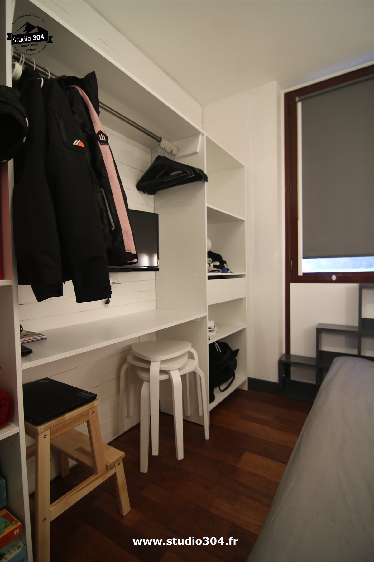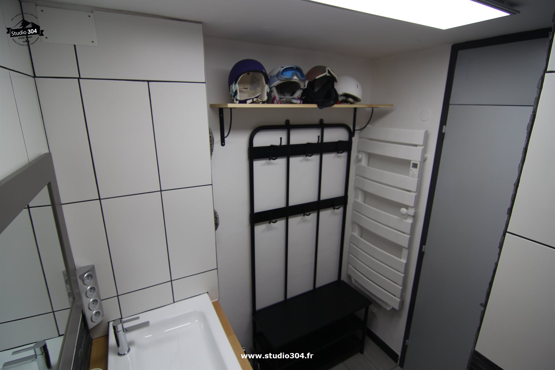Elle est aménagée avec un banc, des rangements et des porte-manteaux.