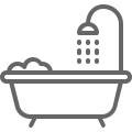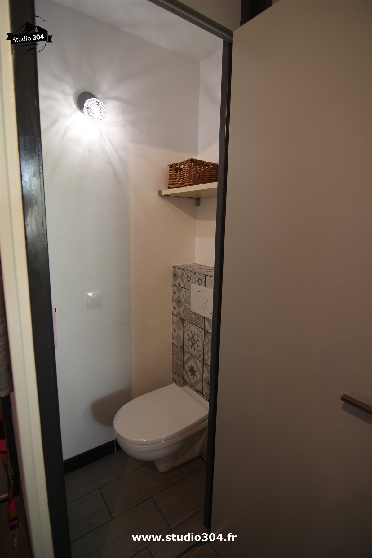Lit 140cmSalle de bains avec baignoire, lavabo double vasque, machine à laver, grand radiateur sèche-serviettes et meuble range-chaussures et porte-manteaux. WC indépendant.